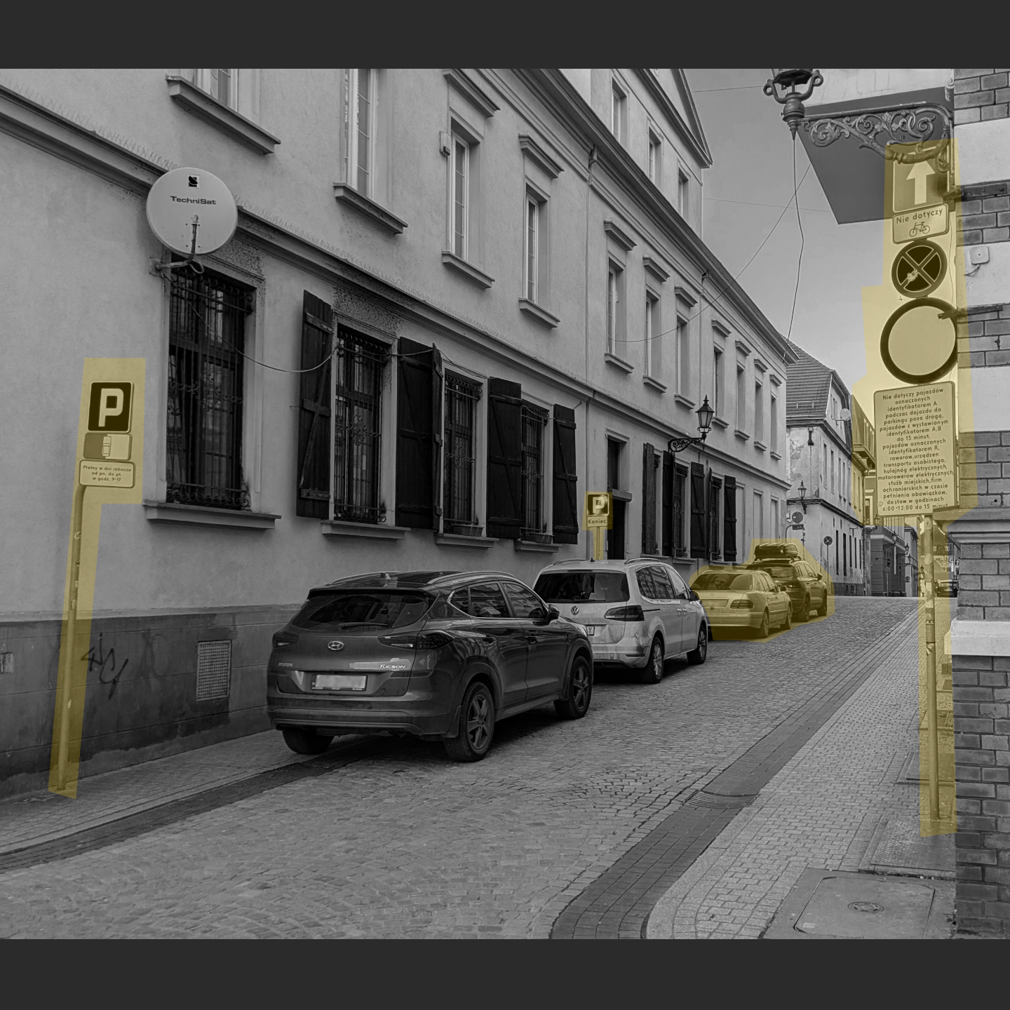 Tu są miejsca do parkowania, ale nie można tutaj parkować (patrz znak). A tam dalej to już w ogóle nie można parkować (brak znaku), ale jest parkowanie.