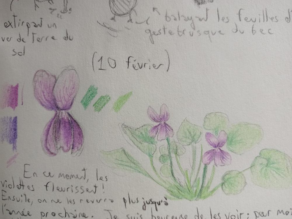 Bannière : extrait de carnet sur lequel on peut voir des dessins de violettes au crayon de couleur.