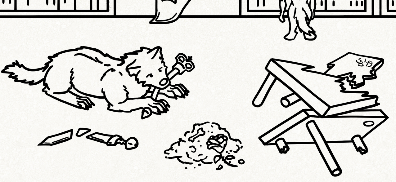Alt-text Banner: Uncoloured digital drawing of a direwolf gnawing a sceptre, next to a broken sword, a pile of ashes with a rope and a broken table.