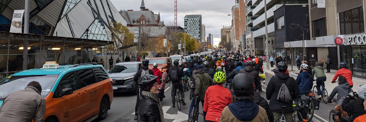 Header alt text: dozens of cyclists Westbound on Bloor St W in Toronto traveling past the ROM, with a handful of cars fully occupying the Eastbound lane.
