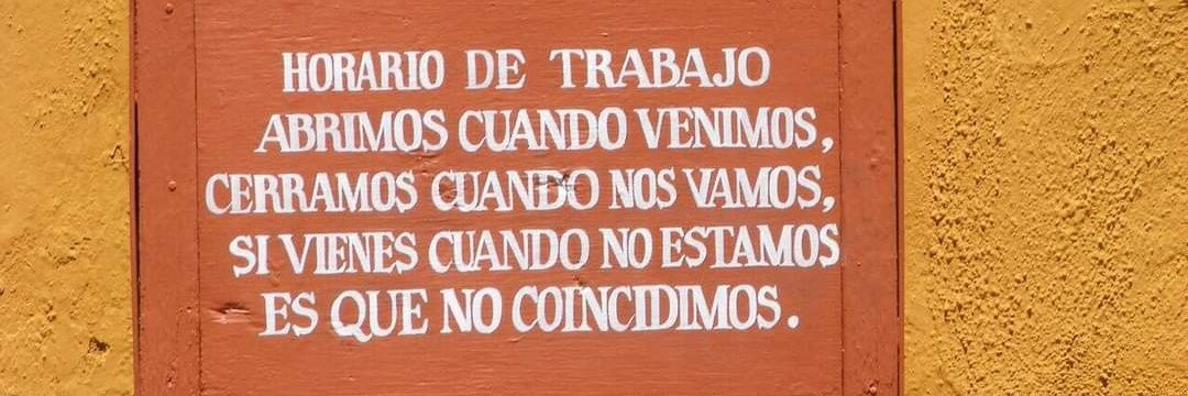 Foto de capa: imagem de uma placa com a seguinte frase "horario de trabajo abrimos cuando venimos, cerramos cuando nos vamos, se vienes cuando no estamos es que no coincidimos".