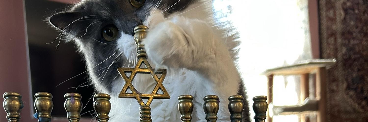 小苗✡️🌳. Here to share the floof. Not quite a cat (yet). Passionate about # cats , cat floof, whiskers, and toe beans (in no particular order)! # FuzzyTummy snorgler. I only boost images with # AltText . Am Yisrael Chai. Profile pic: stylish lynx point Siamese ChunChun wearing a blue beret and a little bow tie. Banner: a grey and white floofy kitty with her paw on the Magen David shamash holder of brass chanukiyah