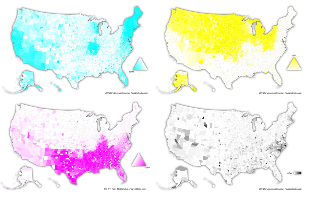 The Pop vs. Soda Page is a linguistic geography project by Alan McConchie (@alan@subdued.social) that maps variations in the terms used for carbonated soft drinks.