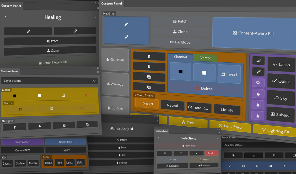 Best on the market # plugin to create your own custom panel for # Photoshop CC. Arrange buttons to best suit your needs. Mix & match columns, rows and tabs to make your perfect layout. Create different layouts for different workflows and separate them by having multiple spaces. Add widgets, change styles, use keyboard shortcuts.