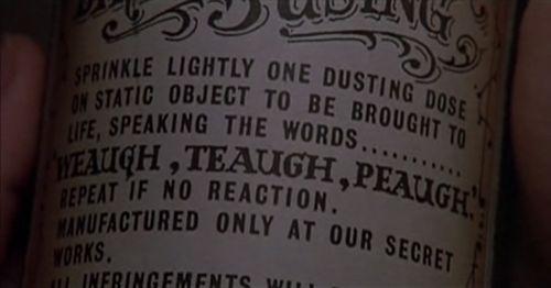 header: powder of life. sprinkle lightly one dusting dose on static object to be brought to life, speaking the words WEAUGH, TEAUGH, PEAUGH.