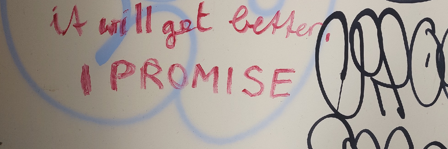 "It will get better, I promise" written on an-off white metal wall that has several other graffiti on it