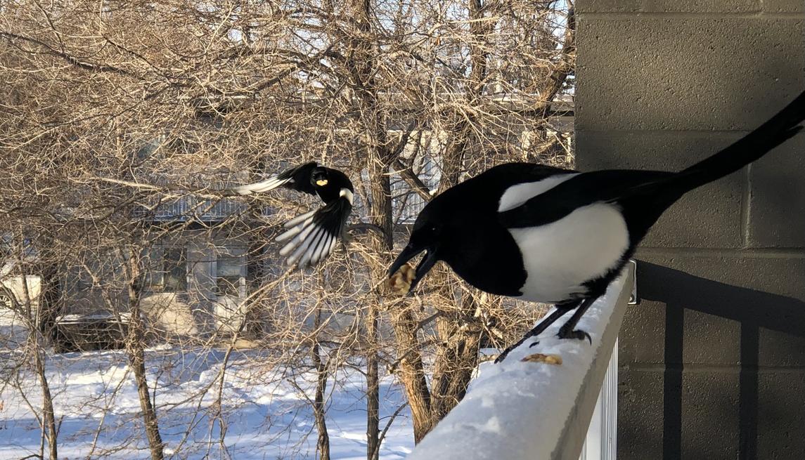 Banner: A magpie perches on a balcony rail to snatch a walnut half while another wings it majestically toward the camera; it is winter